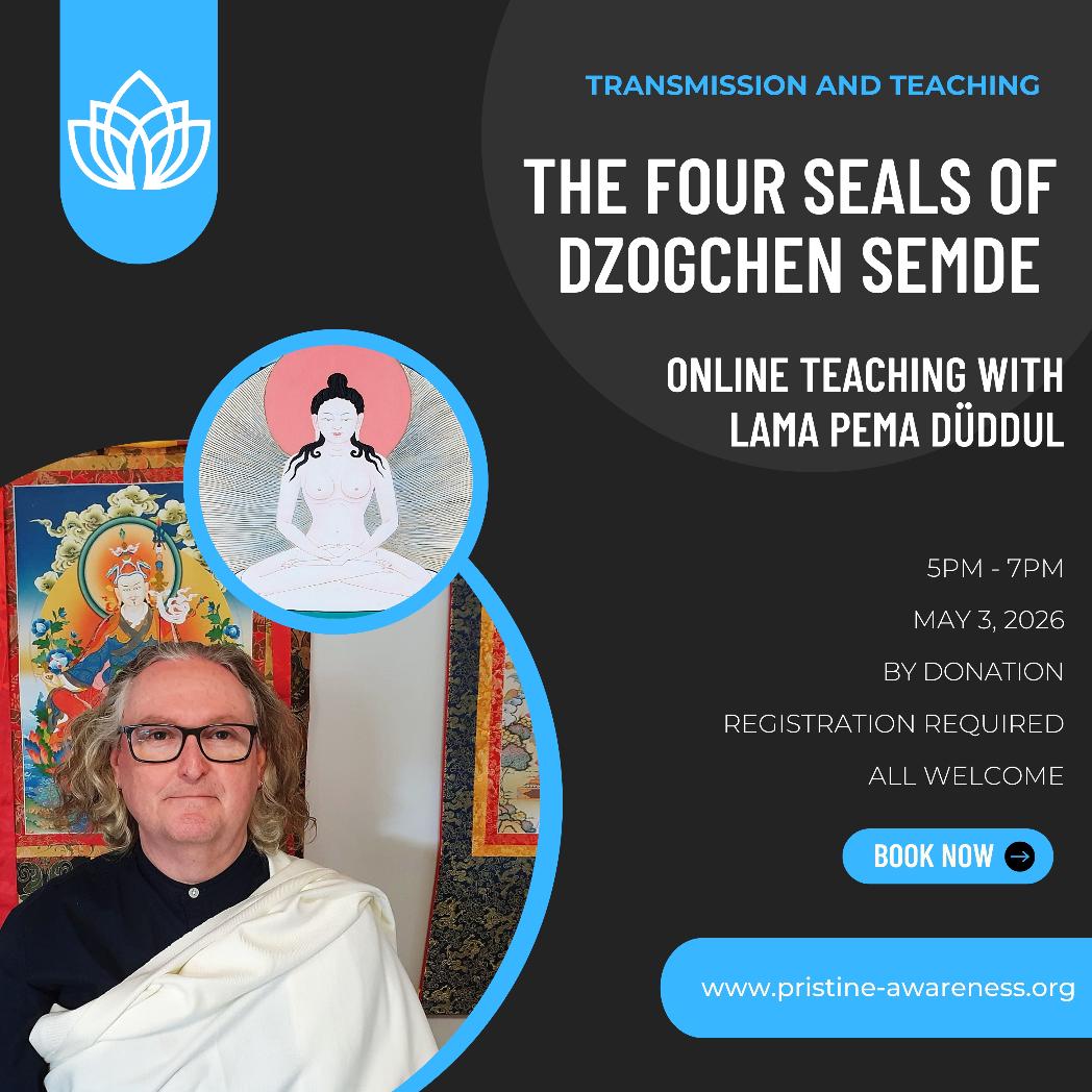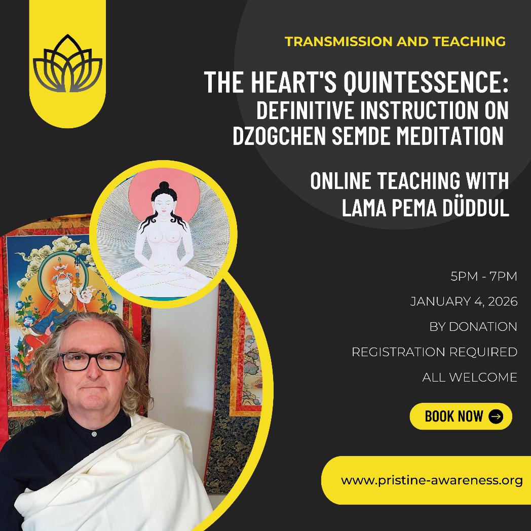 Pristine Awareness: Foundation for Buddhist Practice offers workshops, seminars, short retreats and courses in the heart teachings of Buddhism and the unique practices of the Dzogchen Semde tradition. We teach live online, face to face and in recorded courses you can complete "at your own pace". The workshops and courses offered live online and face to face are listed below. The workshops and courses offered at your own pace (pre-recorded videos and audio) are listed HERE.